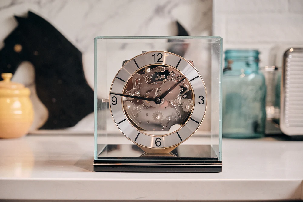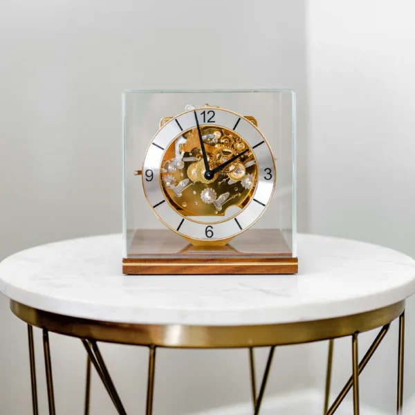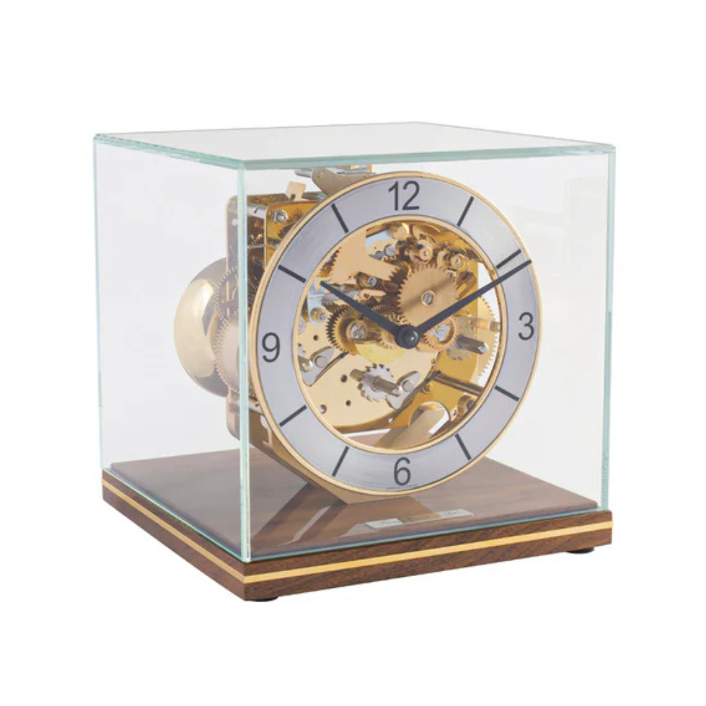 CLARKE minimalistinė kubinė laikrodžio forma puikiai tinka stalo centrui žiūrint iš bet kokio kampo. Mechaninis mechanizmas turi Westminster varpelius, automatinį naktinį išsijungimą ir triukšmo slopinimo svirtį. Geriausia tai, kad visa tai matoma per stiklinį kupolą.