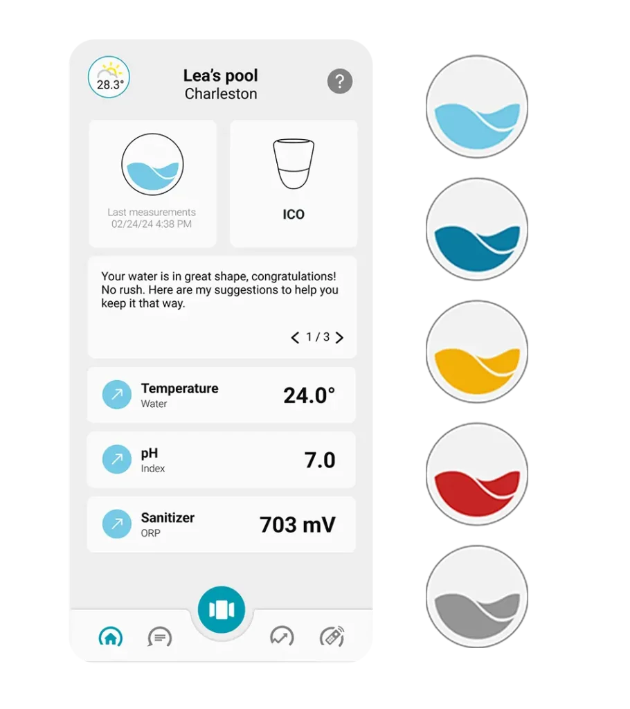 Dėl savo jutiklių ICO kartą per valandą matuoja pH, ORP ir vandens temperatūrą. Druskos versijose ICO taip pat analizuoja TDS (laidumą). Dėl savo algoritmų ICO analizuoja matavimus, numato jų pokyčius ir tada suformuluoja įvairių tipų rekomendacijas dėl taikymo. Šios rekomendacijos, konkrečios ir pritaikytos baseinui, padės jus įpilti tinkamą dozę ir tinkamu laiku. ICO padeda išlaikyti plaukimo baseino vandenį skaidrų. ICO atsižvelgia į baseino tūrį ir jūsų naudojamas valymo priemones.