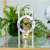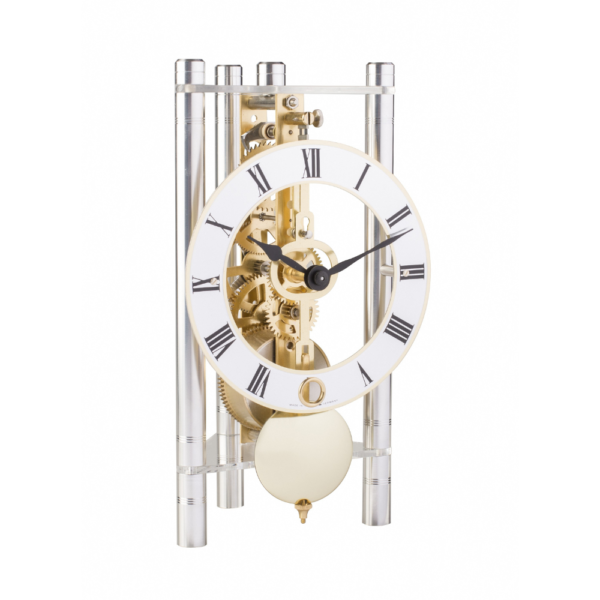 LAKIN stalinis laikrodis su aliuminio kojelėmis (stulpeliai), 8 dienų mechanizmu, platus spalvų pasirinkimas. Trikampė laikrodžio forma pabrėžia atvirą mechanizmą.