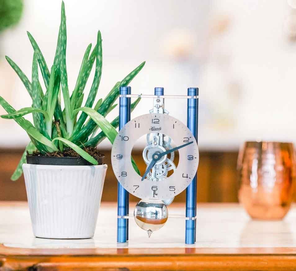 LAKIN stalinis laikrodis su aliuminio kojelėmis (stulpeliai), 8 dienų mechanizmu, platus spalvų pasirinkimas. Trikampė laikrodžio forma pabrėžia atvirą mechanizmą.