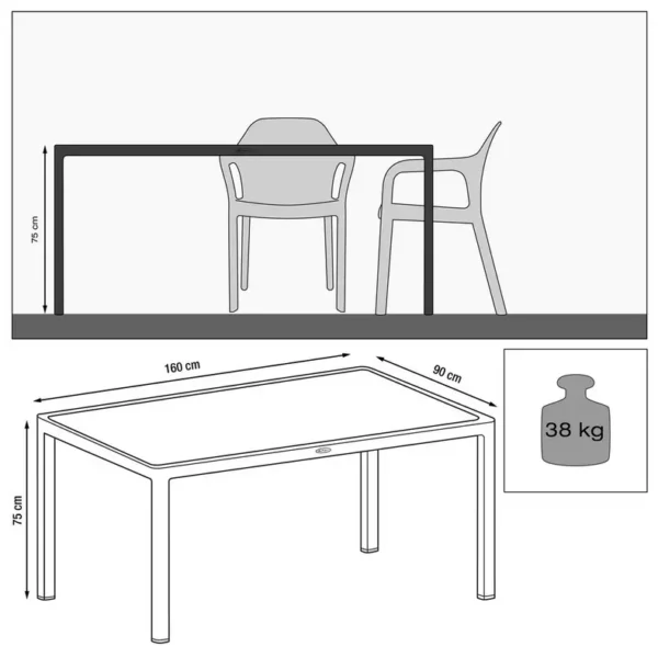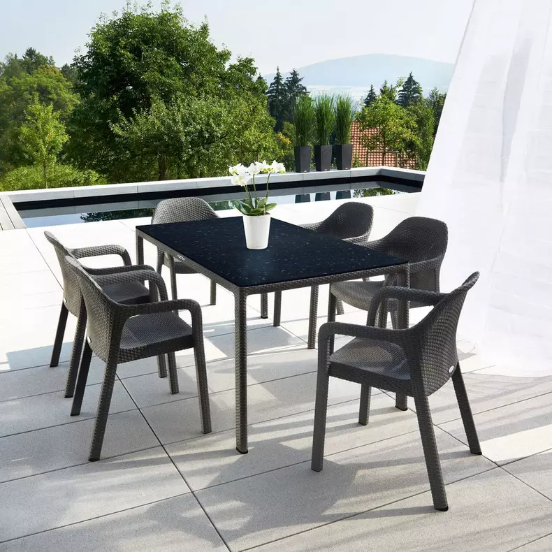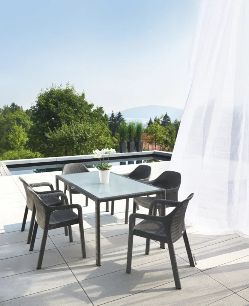 LECHUZA valgomojo stalas – praktiškas, kokybiškas ir elegantiškas pasirinkimas. Sintetinės pintos vytelės rėmas ir grūdinto stiklo stalviršis su nepermatomu laku užtikrina ilgaamžiškumą ir stiliaus vientisumą. Atsparus UV spinduliams, šalčiui, lengvai prižiūrimas. Reguliuojamos kojos garantuoja stabilumą net ant nelygaus paviršiaus.