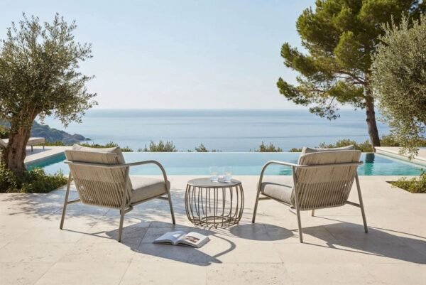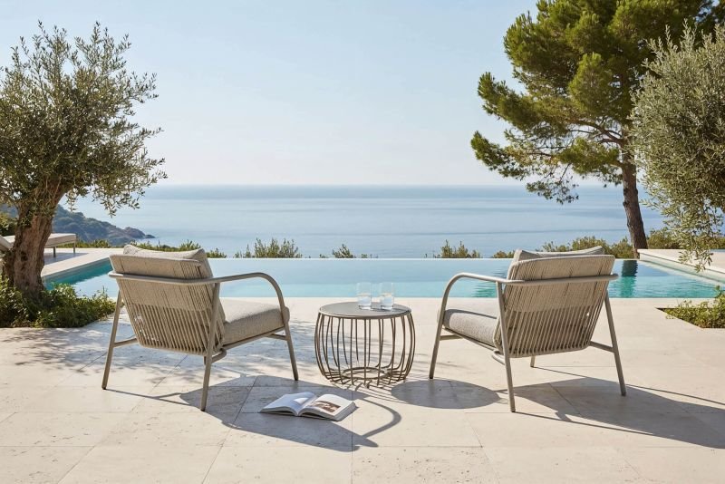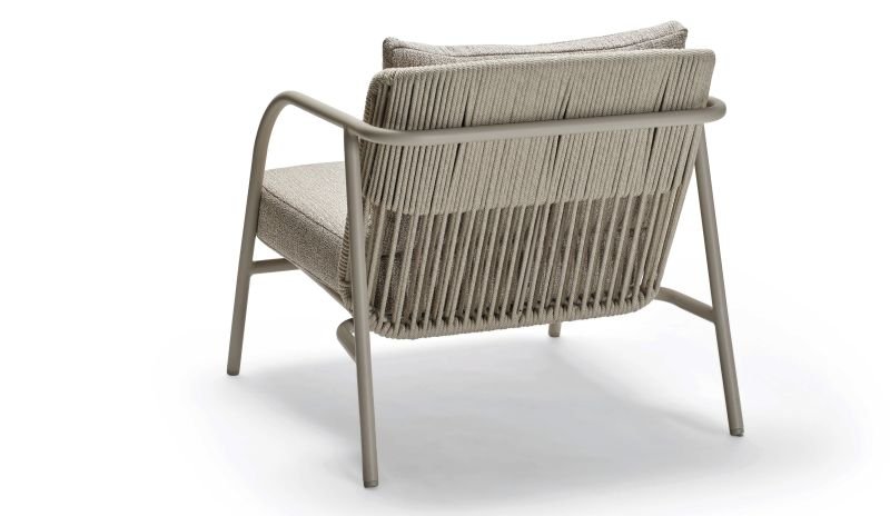 Pilkos spalvos aliuminio rėmas su plona virvele ir melanžo pilkos spalvos pagalvėlE suteikia kolekcijai modernaus lengvumo. Nesvarbu, ar mėgaujatės atpalaiduojančiomis akimirkomis su draugais, ar ilsitės svetainėje – šie baldai pavers jūsų lauko erdvę šilumos ir stiliaus kupina vieta.