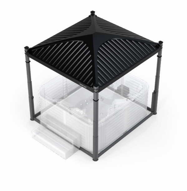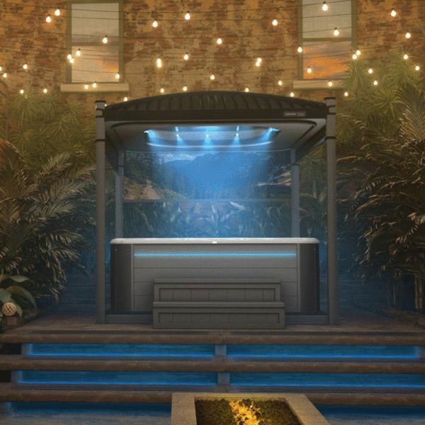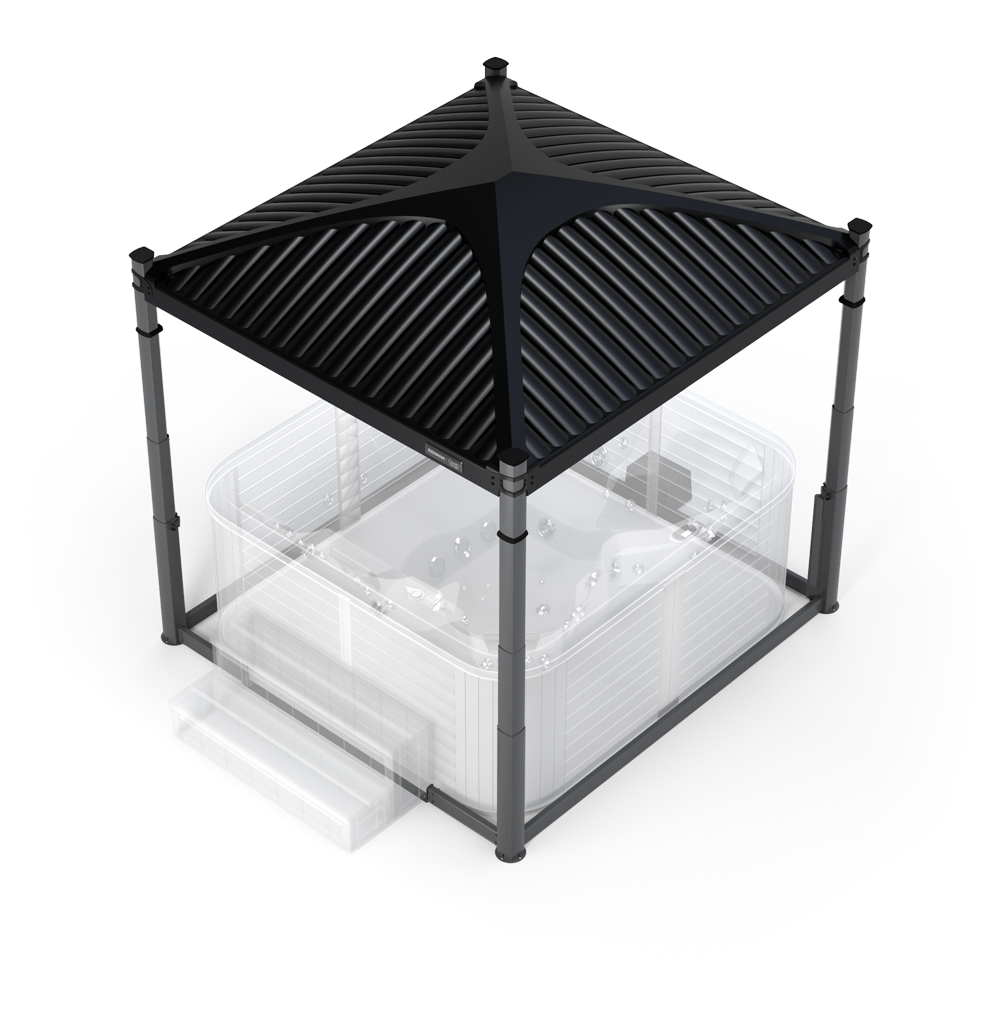 Covana Oasis Midnight – elegantiškas automatinis SPA dangtis su juodomis lubomis ir stogu. Vienu mygtuko paspaudimu jis tampa stilingu stogeliu, suteikiančiu apsaugą nuo oro sąlygų, daugiau privatumo ir jaukią atmosferą visais metų laikais.