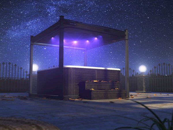 Covana Oasis Midnight išsiskiria juodomis lubomis ir stogu, kurie suteikia erdvei modernios elegancijos. Jis harmoningai dera prie SPA ir poilsio zonos, pabrėždamas aplinkos grožį. Sutemus dangtis susilieja su aplinka ir sukuria jaukią atmosferą.