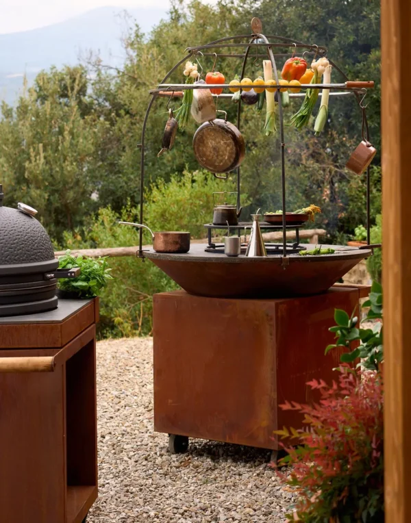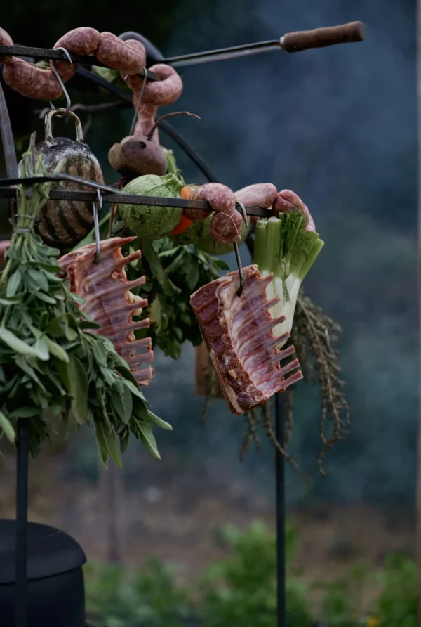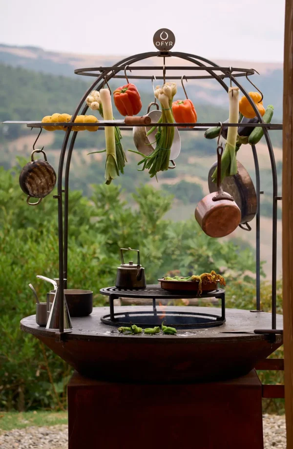 OFYR Cage – puikus aksesuaras profesionalams, kupolo formos konstrukcija leidžia maistą kabinti ant plieninių sijų, sukuriant unikalų ir interaktyvų vaizdinį elementą. Ugnies karštis lėtai kepa ingredientus – nuo ​​mėsos ir žuvies iki vaisių ir daržovių. Kadangi tvirtinamas prie išorinio plokštės krašto, kepimo paviršius lieka laisvas kitų patiekalų ruošimui. Ingredientus ant sijų galima kabinti iešmeliais ir S formos kabliukais.