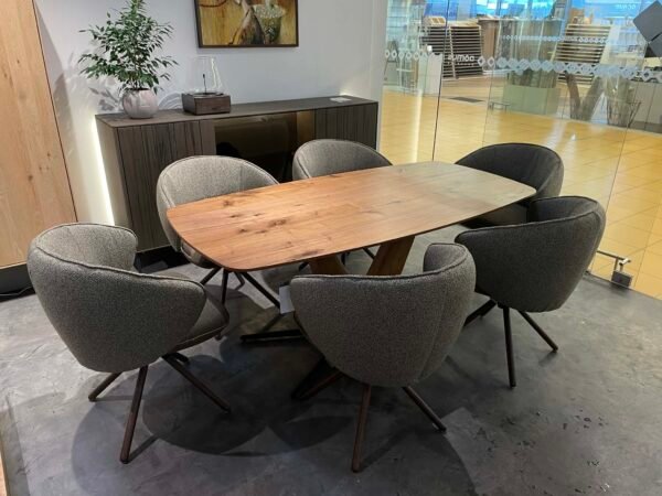 Apmušalas – laisvas, kasdieniškas stilius. Bazė su medžio intarpu iš riešutmedžio. Dviejų medžiagų kombinacija.
